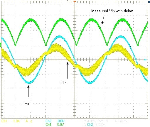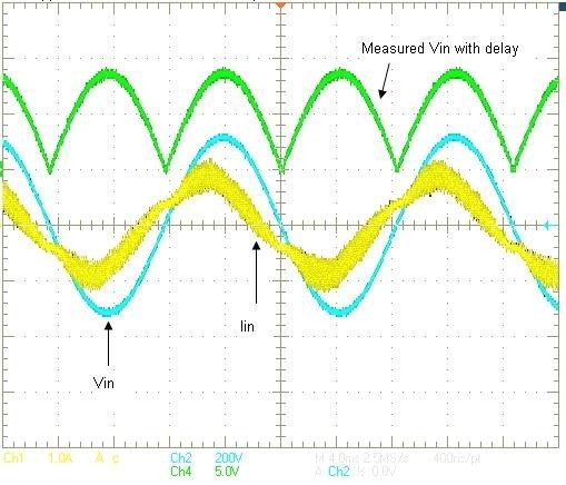 首先,輸入AC電壓通過ADC測量。固件讀取測量到的電壓信號,再加上一些延遲,然後使用延遲後的信號來生成電流參考。圖7、8顯示了1100W無橋PFC的測試結果。在該測試中,VIN=220V,VOUT=360V,而負載=108W(約滿載的10%)。通道1為IIN,通道2為VIN,通道4為帶延遲的測量到的VIN信號。圖7中,測量到的VIN沒有增加延遲,PF=0.86,THD=8.8%.而在圖8中,測量到的VIN信號被延遲了300us,這種情況下,PF被改善到0.90.此外,還可以進一步改善PF,但這將以犧牲THD為代價,因為進一步延遲電流參考,將在AC電壓交叉點處產生更多的電流失真。在圖9中,測量到的VIN被延遲了500us,此時,PF被改善到0.92.但是,電流在電壓交叉點處出現了失真。結果,THD變得更糟糕,達到11.3%.