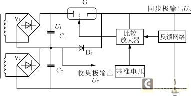 輸入400Hz/220V電源,經高壓變壓器升壓變換後,輸出兩路交流高壓分別送入兩組整流器及濾波器,其中一組作為收集極電壓(Uc=15~18kV,Ic=85mA,而不需要專門做收集極高壓,這是該電路的獨特之處)送入行波管收集極。另外,將整流濾波後的兩組直流電壓串聯,經調整管G穩壓後輸出穩定度很高的直流電壓(UA=20~25kV,Ia≥15mA,穩壓可調)給行波管的同步極。在調整管G的陰極和兩整流器串聯點之間接一個高壓矽柱D3,對調整管G構成過壓保護電路,調整管G出現的最高電壓就是整流器V1空載時的輸出電壓。所以調整管G可以選耐壓很低的管子。同時濾波電容C1、C2的耐壓也相應降低了,因而大大減小了體積和重量。特別是消除了兩組電壓因充放電不一致引起高壓差而打火。