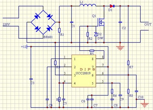 芯片選擇:TI公司的UCC28019可控製功率輸出為100W-2KW,功率因數可提高到0.95,符合設計要求,故此次設計選用該款芯片;