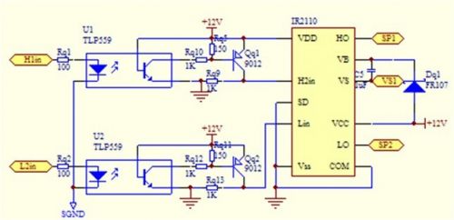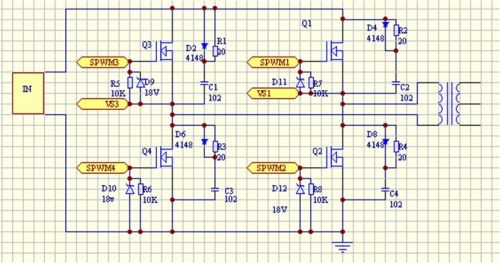 PWM信號通過光耦隔離,經過反相器進入半橋驅動芯片IR2110,如圖所示的Q1、Q2半橋驅動電路,Q3、Q4驅動電路與此電路相同。