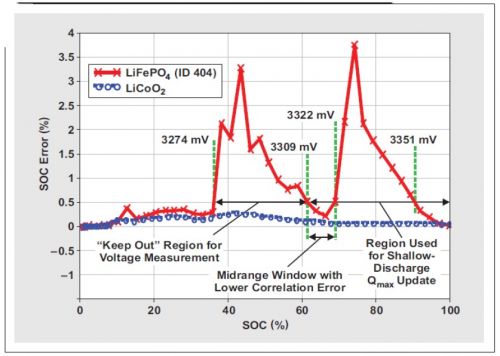 如表 1 所示,化學 ID 404 的 OCV 測量的不合格電壓範圍為 3274mV(最小值,即 ~34% SOC)到 3351mV(最大值,即 ~93% SOC)。大多數磷酸鐵鋰電池都有非常寬的不合格電壓範圍(參見化學 ID 409 進行對比)。然而,根據具體的電池特性,為淺放電 Qmax 更新找出一個更高的最小不合格電壓是可能的。化學 ID 為 404 時,將這一值升高至 3322mV 是可能的,從而允許 3309 到3322 mV 的淺放電 Qmax 更新窗口(請參見圖 2)。shejirenyuankeyishiyongzhezhongzhongjianfanweidiwuchachuangkou,shixianshujushancunxiugai。youyujinnengduigaohedibuhegedianyafanweijinxingsheding,yincizhuxitongbixubaozhengzai 3309mV 以下不會進行更低的 OCV 測量。(隨著關聯誤差的增長,OCV 測量誤差在 3274 和 3309mV 之間急劇增加。)雖然僅有一個 13-mV 窗口在更低 OCV 測量時起作用(3322 – 3309 mV = 13 mV),但其對應於一個 70% 到 64% 的 SOC 範圍。