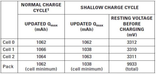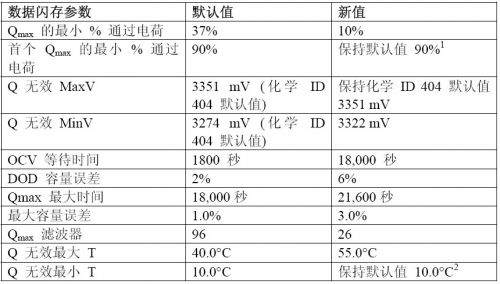 2、 最小通過電荷量必須由電量計進行綜合。默認情況下,其為總電池容量的37%。為了進行淺放電 Qmax 更新,這一通過電荷百分比可以降低至 10%。這種降低的代價是 SOC 精確度的損失,但在其它他無法更新 Qmax 的係統中是容許的。