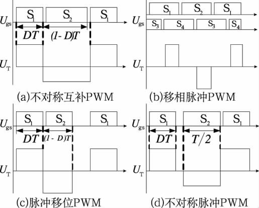 控製型軟開關半橋DC/DC變換器不增加主電路元器件(可增加電感電容元件以實現軟開關條件),通過合理設計控製電路來實現軟開關。圖1給出4種控製型軟開關半橋DC/DC變換器的PWM 控製策略。
