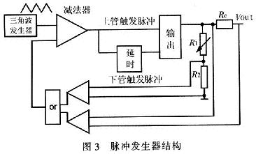 係統采用了電流負反饋電路,以適應激光二極管的要求。當負載變化,電流略大於給定電流時,減小ton寬度,電壓降低。電流略小於給定電流時,增加ton寬度,這樣可以維持電流穩定。圖3所示為脈衝發生器結構。