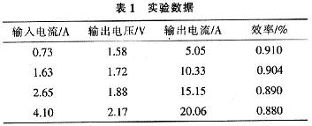 實驗中用50 A的2個二極管串聯作為負載,輸入電壓12 V時,不同電流下輸出及效率如表1所示。