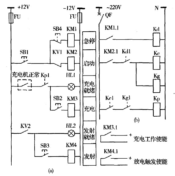 圖3(a)中,KM1-4為SSR,SB1-4為自鎖按鈕。係統上電後,通過按鈕SB1啟動KM1和KM2,這樣Kd將首先得電動作,隨後Kc、Kg、Kp也相繼動作,為下一步進行的充電工作做好了準備。圖3(b)中,Kc和Kg啟動采用了位置接點Kdl,同樣Kp啟動也采用了位置接點Kcl和Kgl,這樣設計目的是使控製電路具有了邏輯動作與防誤閉鎖功能。此時隻要充電設備自檢正常(圖3(a)中"充電機正常"接點閉合),則燈HI 1指示可以進行充電,通過按鈕SB2啟動KM3便可對脈衝電容器組進行充電。脈衝電容器電壓達到預設值後,KV動作,常閉接點KV1斷開致使KM2失電,則Kc、Kg、Kp相繼返回,同時Kp返回又使KM3失電,這樣Kc、Kg斷開,充電機停止工作,滿足了係統放電前提。此時燈HL1熄滅、KV2接通,燈HL2指示充電完畢,通過按鈕SB3啟動KM4則可進行ETCG發射。