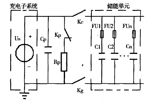 通常,充電子係統內部配有過電流、過電壓和過熱等故障保護或異常告警裝置。但這些裝置的保護範圍一般僅限於充電子係統內部,PPS放電時浪湧電壓等外部因素仍可能造成充電設備損壞。因此,在儲能單元和充電子係統間還需配置一些隔離和保護電路。圖1給出了用於ETCG研究的PPS所配置的充電隔離及保護電路。圖1中,充電隔離開關(Kc)和地絕緣隔離開關(Kg)在充電結束後打開,用以防止PPS放電時由負載等因素產生的浪湧高電壓通過充電子係統對地放電,可以避免因此所造成的充電設備絕緣損壞;充電輸出終端並聯了一小容量電容器(Cp)及其安全釋能電路(開關Kp、電阻Rp),目的在於防止空載誤充電,以避免在此情況下充電電路末端電壓急劇升高損壞充電設備。