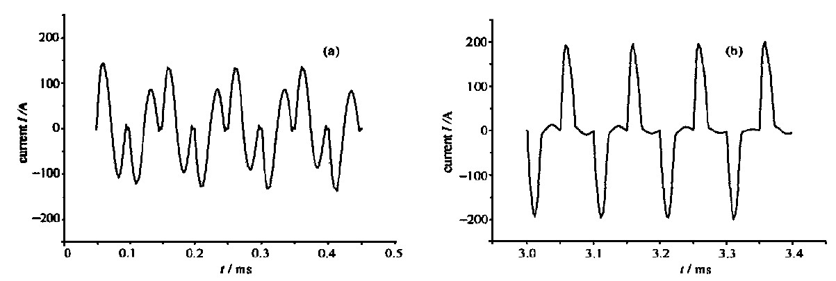 忽略回路電阻, 電路的特征阻抗為Z =√ L/C , 諧振周期為T r = 2π √L/C , 其中C 是諧振電容C r 和折合到原邊的負載等效電容C''串聯後形成的總電容, 通常因高壓變壓器變比高, 等效電容C ''和C r相比較大, 因此串聯後的總電容C 和C r 相差不大。完整的充電電流波形包絡及充電電壓如圖4 所示, 其中t1是轉折點, t1 以前是線性等台階充電, t1 以前電流波形放大如圖5 (a) 所示, 轉折點附近的電流波形如圖5(b) 所示。