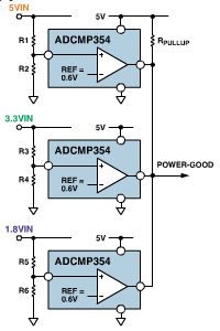 下圖1所示為利用ADCMP361監控多路電壓軌的簡單方法,這是一款內置基準電壓的雙極性輸出、±0.275%精度的比較器 。由於ADCMP361內置400mV高精度基準電壓源,因此可以精確的監控非常低的電壓,例如0.9V 的(de)電(dian)壓(ya)軌(gui)。其(qi)中(zhong),每(mei)路(lu)電(dian)壓(ya)軌(gui)都(dou)使(shi)用(yong)獨(du)立(li)的(de)電(dian)路(lu)。電(dian)阻(zu)分(fen)壓(ya)器(qi)將(jiang)電(dian)壓(ya)軌(gui)按(an)比(bi)例(li)降(jiang)低(di),並(bing)為(wei)每(mei)一(yi)路(lu)電(dian)源(yuan)設(she)置(zhi)一(yi)個(ge)欠(qian)壓(ya)跳(tiao)變(bian)點(dian)。所(suo)有(you)的(de)輸(shu)出(chu)被(bei)連(lian)接(jie)在(zai)一(yi)起(qi),產(chan)生(sheng)通(tong)用(yong)電(dian)源(yuan)良(liang)好(hao)信(xin)號(hao)。