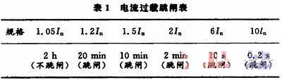在漏電防火控製係統中,電流過載跳閘時間表見表1。