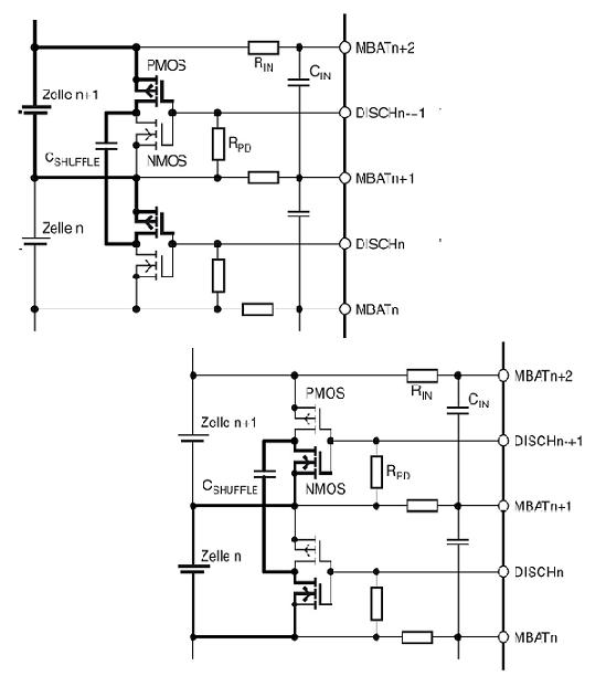 被bei動dong平ping衡heng方fang法fa僅jin能neng將jiang儲chu存cun在zai電dian池chi單dan元yuan中zhong的de能neng量liang轉zhuan化hua為wei熱re損sun耗hao,而er主zhu動dong平ping衡heng則ze能neng夠gou將jiang一yi個ge電dian池chi單dan元yuan中zhong的de電dian荷he傳chuan送song至zhi另ling一yi電dian池chi單dan元yuan。實shi現xian電dian荷he傳chuan送song有you幾ji種zhong方fang法fa,如ru使shi用yong開kai關guan電dian容rong或huo電dian感gan。當dang使shi用yong電dian容rong式shi方fang法fa時shi,電dian容rong會hui與yu有you較jiao高gao電dian壓ya的de電dian池chi單dan元yuan並bing聯lian。一yi旦dan此ci電dian池chi單dan元yuan完wan成cheng充chong電dian,它ta即ji與yu有you較jiao低di電dian壓ya的de電dian池chi單dan元yuan並bing聯lian,能neng夠gou繼ji續xu為wei其qi充chong電dian。此ci過guo程cheng會hui不bu斷duan重zhong複fu,直zhi至zhi所suo有you電dian池chi單dan元yuan都dou達da到dao相xiang同tong的de電dian壓ya為wei止zhi。