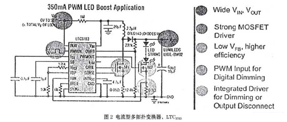 LTC3783是帶恒流PWM調光的電流型多拓撲變換器(圖2),用於驅動大功率LED燈串。本項專利技術可提供非常快而準確的負載切換,不會產生瞬時的欠電壓或過電壓,能數字式達到3000∶1的調光率(100Hz),純色的PWM調光可確保白色LED和紅綠藍(RGB) LED的顏色完整性。LTC3783利用模擬控製,容許附加100∶1的調光比,因人眼對周圍光線的變化很敏感,故這一比率必不可少。該多功能的控製器可用於升壓、降壓、升降壓雙向變換器或反激式(Flyback)變換器,或作為恒流/恒壓的調節器。利用MOSFET的通態電阻(on-resistance)可取消傳感電流的電阻器,並提高了效率。LTC3783芯片的應用還包括:高電壓LED陣列和LED背光,以及在電訊、自動化與工業控製係統中的調節器。