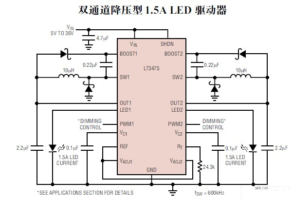 LTC3475以其寬的輸入電壓範圍(4V~36V,max40V),可調節含汽車動力係統在內的廣闊的電源陣列。它的開關頻率調節幅度為200kHz~2MHz,能利用很小的電感器和陶瓷電容器,與耐熱的TSSOP-16組件結合,在驅動2個或4個大電流LED時,可提供結構非常緊湊的解決方案。