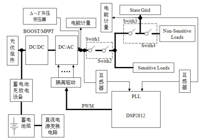 正常工作時,開關Switch1、Switch2、Switch3、Switch4 同時閉合,為當地負荷提供電能;當電網缺相、電壓嚴重跌落等非正常狀況時,由DSP 檢測出異常情況,做出判斷決策,並控製開關的開通與關斷。這時,開通Switch1 和Switch2,關斷Switch3,保證重要負荷的供電。當逆變器發生故障時,立即斷開Switch1,逆變器退出,同時斷開Switch4,由電網 對重要負荷供電。當逆變器故障消失時,再與電網同步後,開通Switch1,在閉合Switch4。恢複對當地負荷的供電。當需要檢修逆變器時,先斷開開 關Switch2,檢修完成後,重新閉合Switch2。