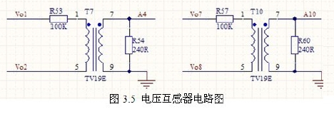 此係統輸出是三相交流電,輸出線電壓為380V,故選擇TV19E 電壓互感器,其輸出負載電阻可以接0~500 歐,輸出交流電壓0~2.5V,此係統采用240 歐的電阻,輸出電壓-1.2V~1.2V。滿足DSP 的輸入要求。電路如圖3.5 所示。