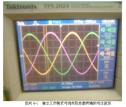 光伏並網發電係統要實現並網,必須使逆變輸出與電網電壓的幅度、相位與頻率達到一致,否則將會使電網諧波增加、電能質量下降,並產生並網環流,甚至造成光 伏發電係統的損壞。因此在並網過程中必須進行同步鎖相控製、輸出電壓幅度控製以滿足並網的要求。根據IEEE Std 1547-2003 規定最大相位誤差為20 度,瞬時電壓誤差不能超過電網電壓的10%、最大頻率誤差不能超過0.3Hz。圖片4-1為獨立工作模式時純電阻負載兩端的電壓波形。