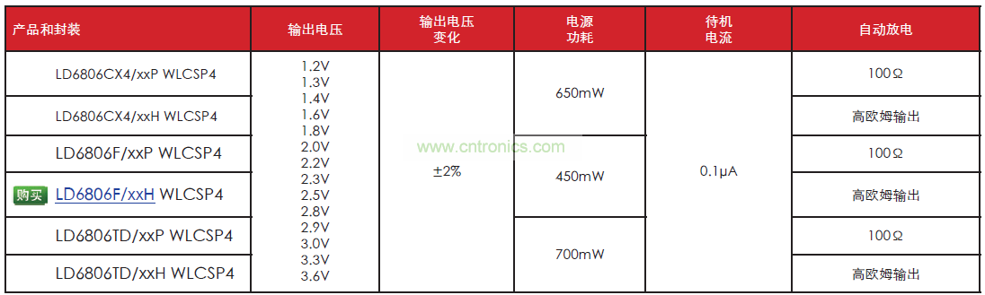 LDO 具有 2.3V 至 5.5V 的輸入電壓範圍,用戶可以訂購從 1.2V 至 3.6V 的 14種不同的輸出電壓。除了大範圍的配置和靈活的封裝選擇之外,LD6806 係列提供 LDO 調節器已形成的優勢,其中包括低輸出噪音和高電源抑製比 (PSRR)。這些設備還受益於 10kV 的 HBM ESD 抗擾度、和高達 700mW 的功耗。