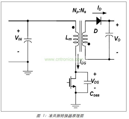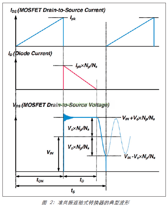 圖 2 顯示準共振返馳式轉換器的典型波形。如果二極管電流在 MOSFET 關閉後達到零,則 MOSFET VDS 會由於原邊電感器 (Lm) 與 MOSFET 輸出電容器 Coss 之間的共振而開始振蕩。在 VDS 達到其最小值時(因漏極與源極之間的電容負載,降低 MOSFET 導通開關損耗),通過開啟 MOSFET 來實現準共振交換。設計變壓器匝數比 Np/Ns,以便共振振幅大於 VIN,從而使零電壓開關 MOSFET 能夠實現。