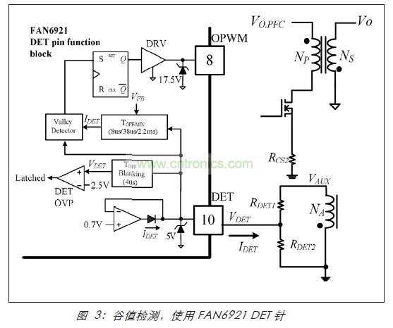 首shou次ci進jin行xing準zhun共gong振zhen轉zhuan換huan器qi設she計ji之zhi前qian,在zai前qian麵mian所suo述shu的de應ying用yong說shuo明ming的de幫bang助zhu下xia,了le解jie將jiang麵mian臨lin的de主zhu要yao問wen題ti是shi一yi件jian非fei常chang值zhi得de的de事shi情qing。正zheng如ru討tao論lun的de那na樣yang,可ke靠kao檢jian測ce MOSFET 電壓穀值是準共振轉換器操作中的要素。某些 PWM 轉換器實施此功能要比其他轉換器做得更好,因此在評價競爭對手的設備時,務必留意這一點。例如,圖 3 顯示使用 Fairchild FAN6921 PWM 控製器的穀值檢測電路的典型應用。通過監視流出穀值檢測針 (DET) 的電流來檢測MOSFET的電壓穀值;當流出檢測針的電流超過30μA 時,將觸發該電路。這是特別有吸引力的解決方案,因為它隻需要一個變壓器輔助線圈和兩個電阻。