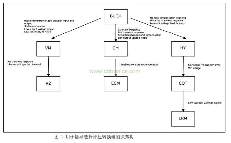 因(yin)此(ci),在(zai)基(ji)本(ben)電(dian)源(yuan)拓(tuo)撲(pu)結(jie)構(gou)的(de)頂(ding)部(bu),降(jiang)壓(ya)轉(zhuan)換(huan)器(qi)需(xu)要(yao)一(yi)個(ge)可(ke)管(guan)理(li)占(zhan)空(kong)比(bi)的(de)控(kong)製(zhi)係(xi)統(tong),才(cai)能(neng)獲(huo)得(de)靜(jing)態(tai)和(he)動(dong)態(tai)性(xing)能(neng)屬(shu)性(xing),例(li)如(ru)輸(shu)出(chu)電(dian)壓(ya)準(zhun)確(que)度(du)、瞬態響應和穩定性。有三種控製降壓轉換器的基本方法:電壓模式、電流模式和滯環模式。 每個控製流程的簡要說明。