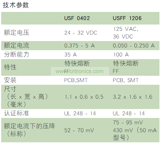 這兩款保險絲都經過精心的開發設計,專用於為次級電路提供過流保護。 USF 0402 的額定電流範圍為 375 mA 至5 A,額定電壓為 32 VDC(最大 4 A)和 24 VDC(最大 5A)。 分斷能力是在額定電壓下為 35 A。 USFF 1206 的額定電流較小,其額定電流範圍為 50 至 250 mA,額定電壓為 63 VDC,分斷能力為 100 A。