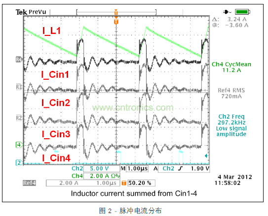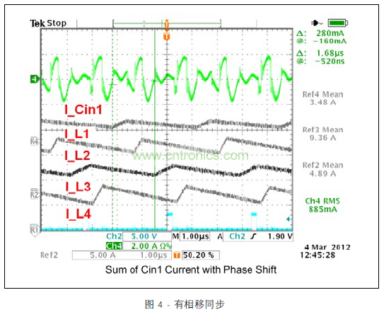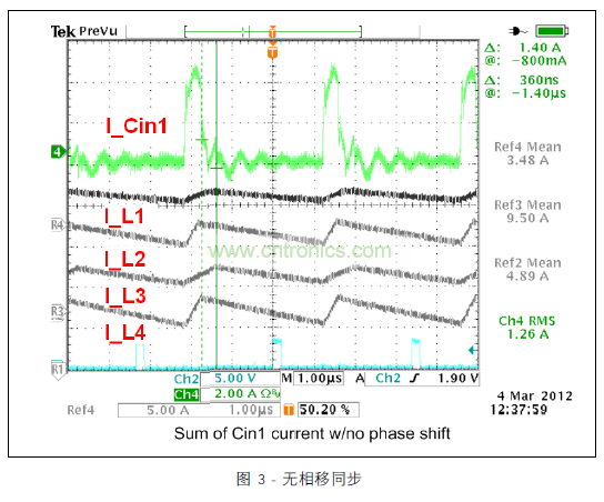 圖 3 顯示的範圍圖片涵蓋所有四個開關階段中的電感器電流與去耦合通道 1 的輸入電容器的脈衝電流。