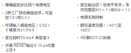 如果某一受監控的電源電壓降至最小電壓閾值以下,就會有一個低電平有效輸出置位,觸發係統複位。輸出為開漏式,具有典型值為10 μA的較弱內部上拉電流,以便拉至受監控的IN2電源電壓。所有電壓均超過選定的閾值電平時,