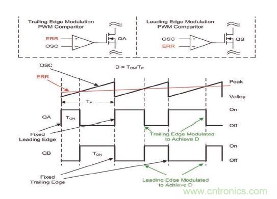 前沿調製脈寬調製稍微不同於後沿調製。OSC信號饋送至非反相脈寬調製比較器輸入,而誤差電壓則饋送給反相引腳。FET (QB) 關閉與OSC峰值電壓和前沿同步,當FET導通時對前沿進行調製以達到占空比(請參見圖 2)。