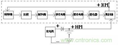 如圖2圖3示 ,合閘母線(+HM)經過矽降壓回路降壓後,形成正控製母線(+KM),+KM經自動調壓回路采樣後,采樣值送到比較判斷回路,在此處進行比較。如果+KM沒有高於預先設好的範圍,則觸發電路不動作。移位執行電路也不動作,相應的繼電器也不動,電路保持原狀態,+KM值保持不變,如果+KM超chao出chu了le預yu先xian設she好hao的de範fan圍wei,則ze比bi較jiao判pan斷duan回hui路lu發fa出chu信xin號hao,告gao之zhi觸chu發fa電dian路lu,觸chu發fa電dian路lu立li即ji發fa出chu脈mai衝chong,觸chu發fa移yi位wei寄ji存cun器qi,移yi位wei寄ji存cun器qi開kai始shi向xiang左zuo或huo向xiang右you執zhi行xing移yi位wei,從cong而er使shi電dian路lu驅qu動dong繼ji電dian器qi動dong作zuo。繼ji電dian器qi相xiang應ying的de節jie點dian打da開kai或huo閉bi和he,來lai實shi現xian矽gui二er極ji管guan是shi串chuan入ru還hai是shi脫tuo離li+KM回路,於是實現+KM按電力標準規定的範圍內變化,從而實現了自動調節+KM電壓。