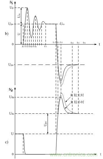 到t4時刻之後,輸入電壓ui對分布電感Ls和分布電容Cs進行充電的過程,以及分布電感Ls和分布電容Cs互相進行充電的過程,與t0~t4時刻基本相同。但由於在此期間,輸入電壓的上升率等於0,輸入電壓不再向分布電感Ls和分布電容Cs提供能量,因此,分布電感Ls與分布電容Cs產生自由振蕩的幅度是隨著時間衰減的,其衰減速率與等效電阻大小有關。