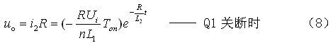 (8)式中,L1、L2分別為開關變壓器初、次級線圈的電感,n為開關變壓器線圈的匝數比,n=N2/N1,Ui為變壓器初級線圈的輸入電壓,Ton為開關管的導通時間,R為等效負載電阻。