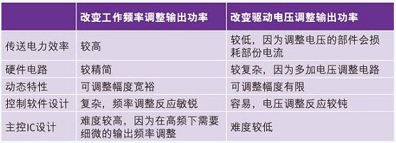 在諧振係統中調整功率的方式另外還有改變線圈上的電感值或電容值的方法,但在實際量產上並不容易完成所以不被采用。在圖(五)是無線充電聯盟規格書中所提的兩種控製發射線圈輸出功率的方法,第一種是變頻調整式,另一種則是變壓調整式。