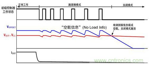 圖1是shi進jin入ru關guan閉bi模mo式shi的de過guo程cheng。當dang輸shu出chu電dian流liu從cong滿man載zai慢man慢man降jiang低di時shi,初chu級ji控kong製zhi器qi會hui從cong正zheng常chang工gong作zuo轉zhuan換huan成cheng跳tiao周zhou期qi工gong作zuo,輸shu出chu電dian壓ya和he空kong載zai信xin息xi基ji本ben上shang比bi較jiao接jie近jin;當輸入極低跳周期或關閉模式時,輸出空載電壓將低於輸出電壓,從而檢測到極低負載或空載,激活關閉模式。