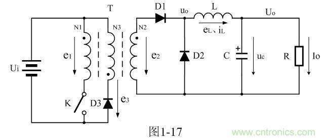 圖1-17是正激式變壓器開關電源的簡單工作原理圖,圖中,Ui是開關電源的輸入電壓,T是開關變壓器,N1、N2、N3分別為開關變壓器的3個線圈繞組,e1、e2、e3分別為3個線圈繞組產生的感應電動勢,K是控製開關,D1是整流二極管,D2是續流二極管,D3是削反峰整流二極管,L是儲能濾波電感,C是儲能濾波電容,R是負載電阻;uo為整流輸出電壓,或濾波輸入電壓、eL為儲能濾波電感產生的感應電動勢、iL為流過儲能濾波電感L的電流、Uo為濾波輸出電壓、Io為流過負載的電流。