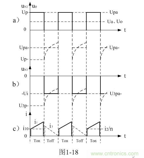 圖1-18-c)是流過變壓器初級線圈N1和次級線圈N3的電流波形,其中,實線部分是流過變壓器初級線圈N1的電流波形,虛線部分是流過變壓器次級線圈N3的電流波形。