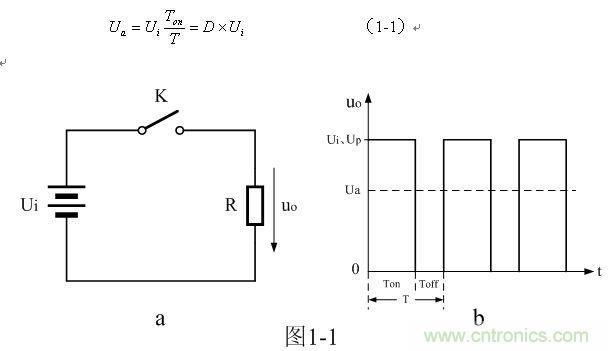 圖1-1-b是串聯式開關電源輸出電壓的波形,由圖中看出,從控製開關K輸出電壓uo是一個脈衝調製方波,脈衝幅度Up等於輸入電壓Ui,脈衝寬度等於控製開關K的接通時間Ton,由此可求得串聯式開關電源輸出電壓uo的平均值Ua為:
