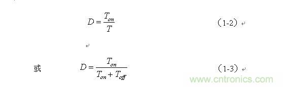式中Ton為控製開關K接通的時間,T為控製開關K的工作周期。改變控製開關K接通時間Ton與關斷時間Toff的比例,就可以改變輸出電壓uo的平均值Ua 。一般人們都把 稱為占空比(Duty),用D來表示,即: