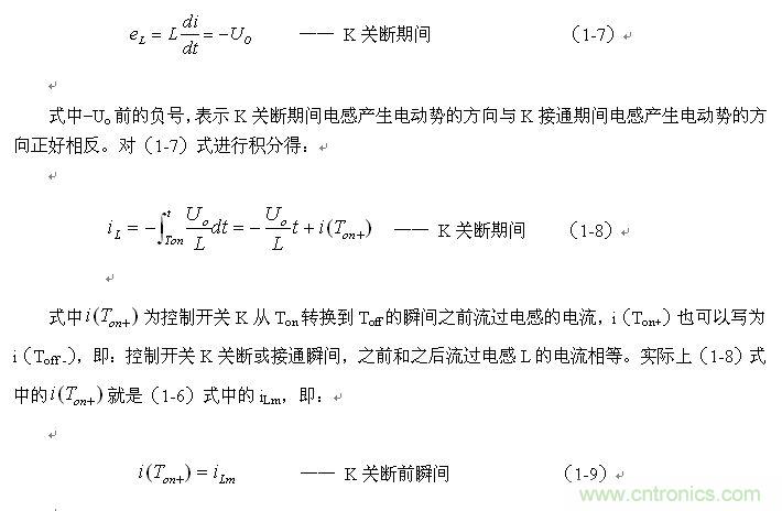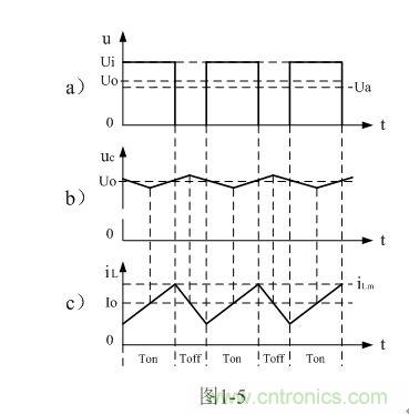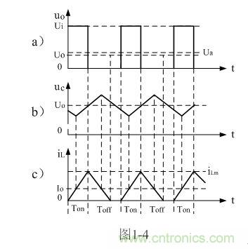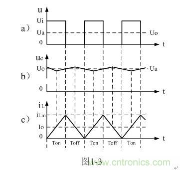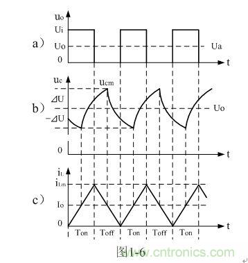 在此順便說明:由於電容兩端的電壓變化量ΔU相對於輸出電壓Uo來說非常小,為了簡單,我們這裏把Uo當成常量來處理。在某種情況下,當我們需要對電容的初次充、放電過程進行分析時,必須需要建立微分方程,並求解。當開關電源剛開始工作時,由於輸出電壓Uo的建立需要一定的時間,因此,輸出電壓Uo的(de)建(jian)立(li)也(ye)需(xu)要(yao)一(yi)個(ge)過(guo)渡(du)過(guo)程(cheng),如(ru)對(dui)此(ci)過(guo)渡(du)過(guo)程(cheng)進(jin)行(xing)精(jing)確(que)計(ji)算(suan),得(de)出(chu)的(de)結(jie)果(guo)中(zhong)一(yi)般(ban)都(dou)含(han)有(you)一(yi)指(zhi)數(shu)函(han)數(shu)項(xiang),當(dang)令(ling)時(shi)間(jian)變(bian)量(liang)等(deng)於(yu)無(wu)窮(qiong)大(da)時(shi),即(ji)電(dian)路(lu)進(jin)入(ru)穩(wen)態(tai)時(shi),再(zai)對(dui)相(xiang)關(guan)參(can)量(liang)取(qu)平(ping)均(jun)值(zhi),其(qi)結(jie)果(guo)就(jiu)基(ji)本(ben)與(yu)(1-4)相等。