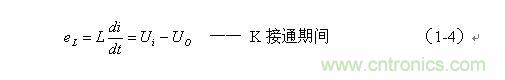 在Ton期間,控製開關K接通,輸入電壓Ui通過控製開關K輸出電壓uo,然後加到儲能濾波電感L和儲能濾波電容C組成的濾波電路上,在此期間儲能濾波電感L兩端的電壓eL為: