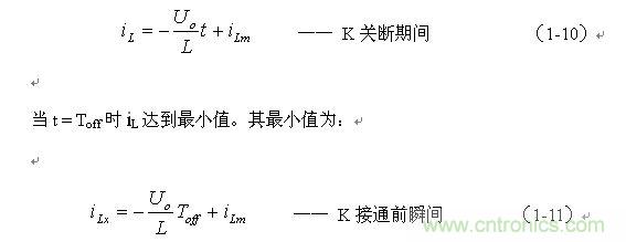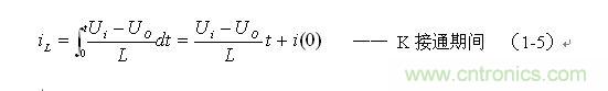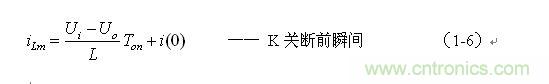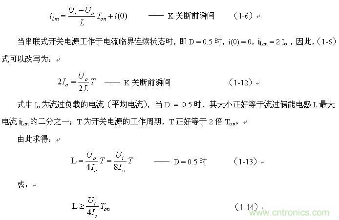 串聯式開關電源最好工作於電流臨界連續狀態,或連續電流狀態。此時,開關電源輸出電壓的調整率為最好,且輸出電壓Uo的紋波也不大。因此,我們可以從電流臨界連續狀態著手進行分析。我們先看(1-6)式:
