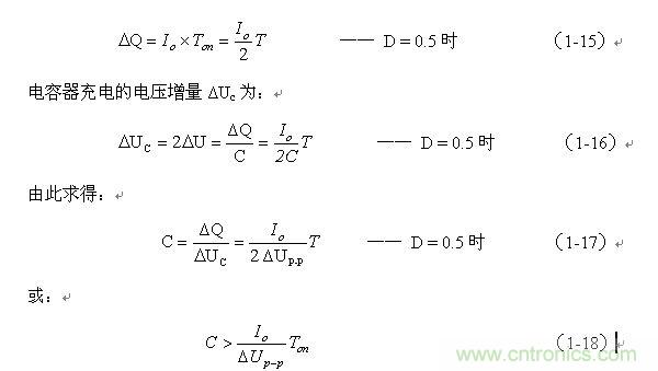 同理,(1-17)和(1-18)式的計算結果,隻給出了計算串聯式開關電源儲能濾波電容C的中間值,或平均值,由於輸出電流的不確定性,實際應用時,可以以此為極限,在此平均值的計算結果上再乘以一個大於1的係數。