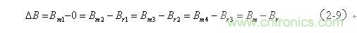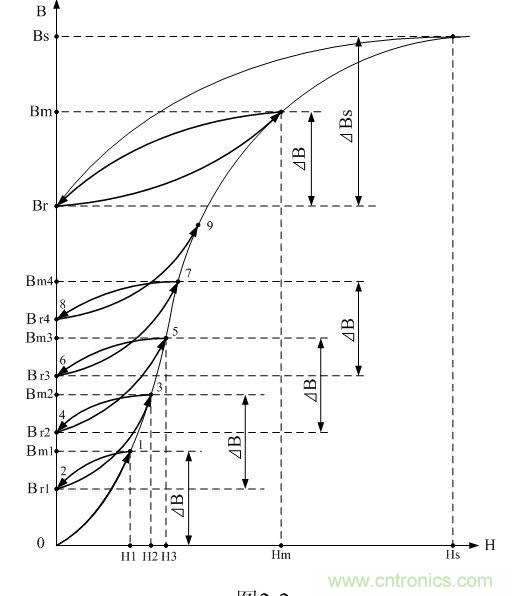 同理,當第二個直流脈衝加到變壓器初級線圈a、b兩端時,變壓器鐵芯中的磁感應強度B將按圖2-2中新的磁化曲線2-3上升,磁感應強度被磁場強度磁化到第二個最大值Bm2,使磁感應強度產生一個增量ΔB,  。