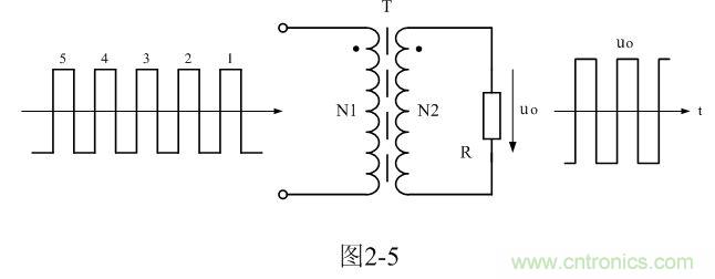 為了簡單起見,我們把雙激式變壓器開關電源等效成如圖2-5所示電路。圖2-5與圖2-1所示電路的不同之處在於,圖2-1輸入電壓是直流脈衝方波,而圖2-5輸入電壓是交流脈衝電壓方波。因此,圖2-5所示電路與一般的變壓器電路在工作原理上沒有根本的區別。