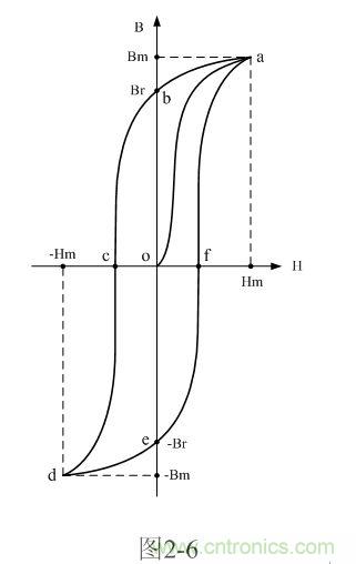 從圖2-6還可以看出,雖然磁感應強度被磁場強度磁化的時候可以同時到達正、負最大值,但在磁場強度經過零的時候,磁感應強度與磁場強度總是出現一個相位差。所以,圖2-6中由abcdfa各線段組成的曲線也被稱為磁滯回線,因此,圖2-6也可以稱為雙激式變壓器鐵芯的磁滯回線圖。