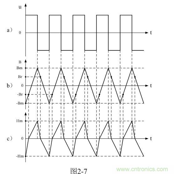 從圖2-7-a)和圖2-7-b)可以看出,每輸入一個交流脈衝電壓,變壓器鐵芯中的磁感應強度B或磁通