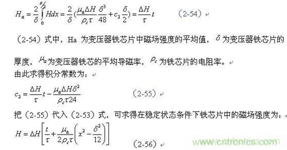 由於在變壓器鐵芯片內,截麵磁場強度的平均值Ha,在任一時間內都必須等於電磁感應所要求的值,即滿足(2-40)式的要求,因此對應圖2-19對(2-53)式求平均值得: