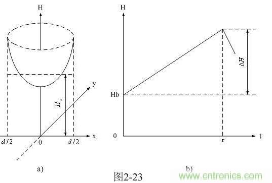 圖2-20-a和圖2-20-b分別是由(2-56)式給出的,鐵芯片中磁場強度按水平方向分布的函數H(x)和按時間分布的函數H(t)曲線圖。