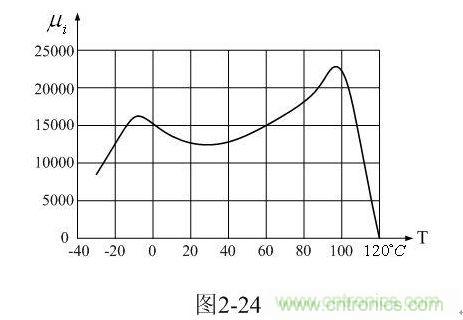 順便說明,圖2-24中的初始導磁率 一般是用磁環作為樣品測試得到的,測試信號的頻率一般比較低,僅為10kHz,並且測試時一般都選用最大導磁率作為結果;因此,實際應用中的開關變壓器鐵芯的導磁率並沒有這麼高。