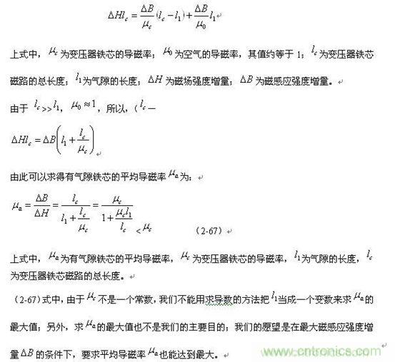 最大值的條件;當然是氣隙長度越小,平均導磁率 就越大。但在實際工作中, 的值要小於此值,因為,對氣隙長度要預留一定的餘量,變壓器鐵芯的工作點不可能讓永遠工作在最佳值的邊沿;因此,實際工作中的變壓器鐵芯,其最大磁感應強度增量和最大磁場強度增量都會超出(2-68)式給出條件的範圍;所以,由(2-68)式求出的氣隙長度 也是最低極限值。