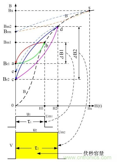 圖9是開關變壓器伏秒容量與磁場強度H、磁感應強度B的對應關係圖。圖中,脈衝幅度V總是與磁感應強度的增量